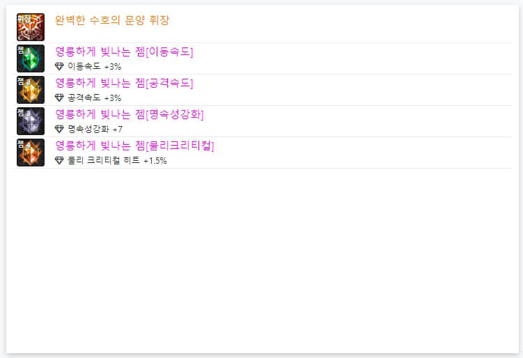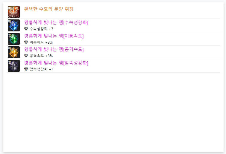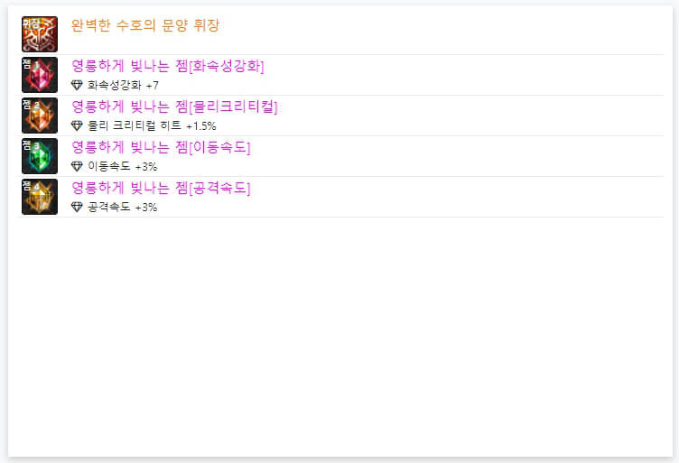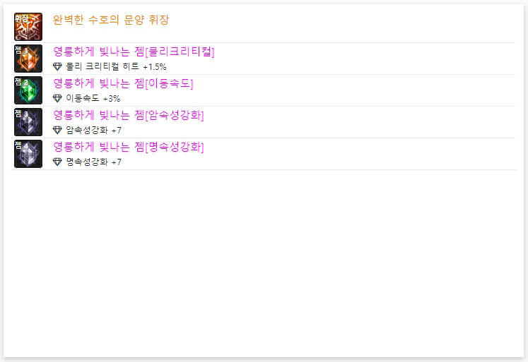먼저 휘장을 살펴보면 6명 모두 '완벽한 수호의 문양 휘장'을 선택했습니다. 휘장은 직업에 따라 결정되기 때문에, 100% 동일함을 알 수 있습니다. 그리고 휘장 아래에 보석처럼 보이는 것을 '젬'이라고 하며, 휘장 1개당 4개의 젬을 선택할 수 있습니다. 보통 딜러들은 '공격 속도, 이동속도, 크리티컬, 속성 강화'를 많이 사용합니다. 공격 속도가 필요하지 않은 직업이라면 '캐스트 속도'를 사용합니다. 위 6명의 랭커를 보면 공격 속도를 선택하지 않고 2가지 속성 강화를 선택한 랭커도 있습니다. 젬은 꼭 랭커를 따를 필요가 없으며, 캐릭터 속성 강화에 따라 젬을 선택할 수 있습니다.