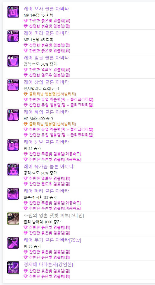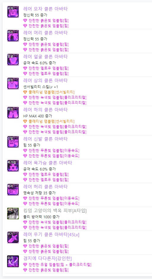던파 OFF에서 7월 22일 기준으로 랭커 6명의 아바타입니다. 기본적으로 전부 레어 클론 아바타를 입고 있습니다. 보조 캐릭터가 아닌 메인 캐릭터라면 기본적으로 레어 클론 아바타를 사용됩니다. 전체적으로 엠블렘을 볼 때, '힘과 물리 크리티컬'을 주로 선택했습니다. 즉, 엠블렘에 힘과 물리 크리티컬을 선택할 수 있는 곳이라면 힘과 물리 크리티컬을 사용하고 있습니다. 그리고 레어 무기 클론 아바타 레벨은 45를 4인, 75를 2인이 선택하였습니다. 주 스킬에 따라 레어 무기 클론 아바타 레벨을 선택할 수 있습니다. 이것은 다음 시간에 설명할 탈리스만 선택과 관련이 있습니다. 일반적으로 탈리스만 룬 스킬의 레벨과 레어 무기 클론 아바타 레벨과 동일합니다. 그리고 레어 클론 아바타 상의, 하의의 플래티넘 엠블렘은 '센서빌리티'를 사용하고 아바타 상의 선택 옵션도 '센서빌리티'를 선택하였습니다. 마지막으로 버프 강화 스위칭용 상의 아바타 옵션은 버프 스킬인 '액티베이션'을 선택하였습니다.