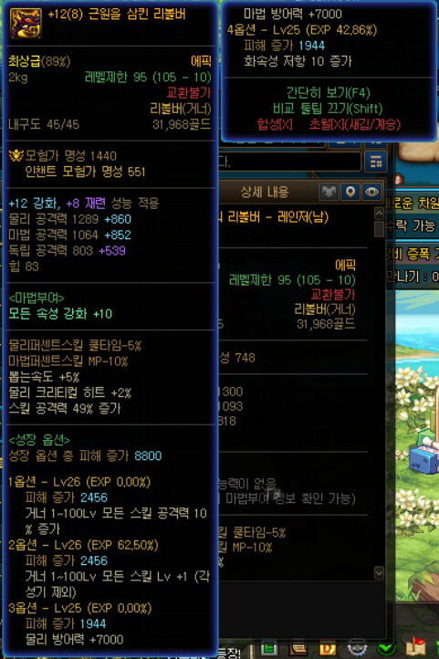 이제 다른 장비 아이템을 살펴보겠습니다. 105제 아이템이 처음 나왔을 때, 랭커들이 많이 사용하는 아이템이 있었습니다. 마법석에서 '억류된 혼의 령주'이고 하의에서 '옥화의 망령 대퇴갑'입니다. 다행히 지금은 대체 아이템이 많이 나온 거 같아서, 이 두 가지의 아이템을 거의 사용하지 않는 것 같습니다. 저도 추천하지 않습니다. 그 이유는 옵션을 보면 '억류된 혼의 령주'의 경우 보유하고 있는 크리쳐의 수에 따라 데미지 옵션이 증가하고 '옥화의 망령 대퇴갑'의 경우 보유 아바타의 수에 따라 데미지 옵션이 증하기 때문입니다. 즉, 두 아이템 모두 기본적으로 비용이 많이 듭니다. 그래서 여유가 된다면 별로 신경 쓰지 않겠지만 추천하지는 않습니다.