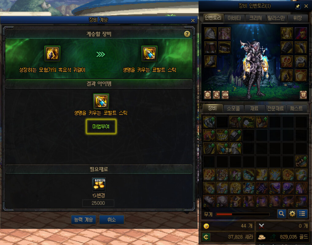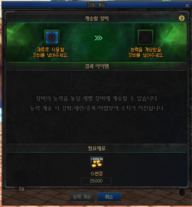 | 2. 동일한 부위의 장비에만 장비 능력을 계승할 수 있습니다. |
