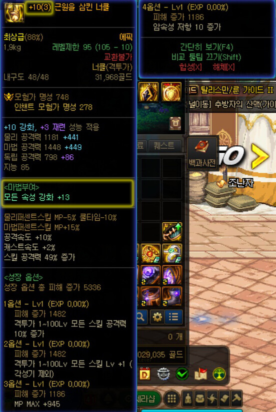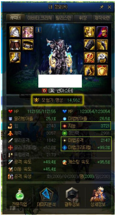 저의 남넨마스터 장비 아이템 모습입니다. 이번 이벤트로 아이템을 받은 신규 캐릭터이기 때문에 강화나 증폭은 없고 전부 마법 부여만 되어 있습니다. 위에 표시한 '마법 부여' 부분이 교체되는 장비로 전달될 거라고 생각하시면 됩니다.