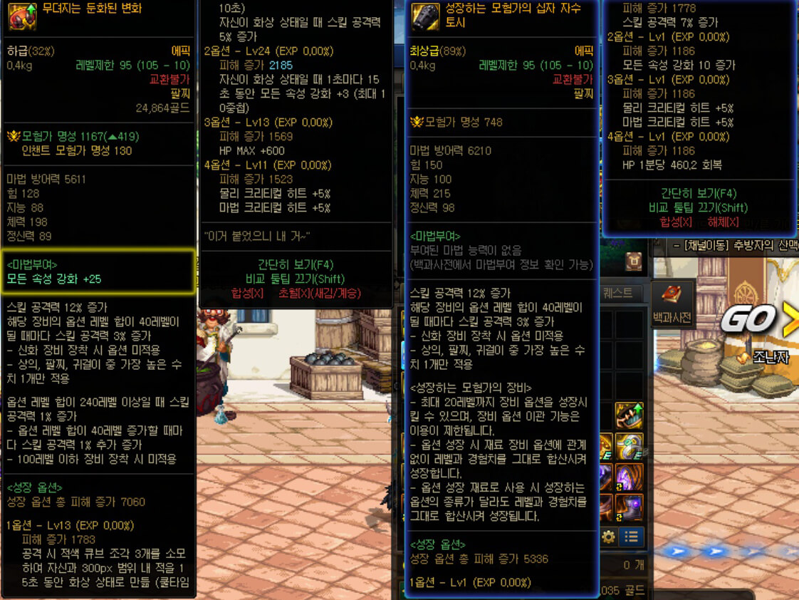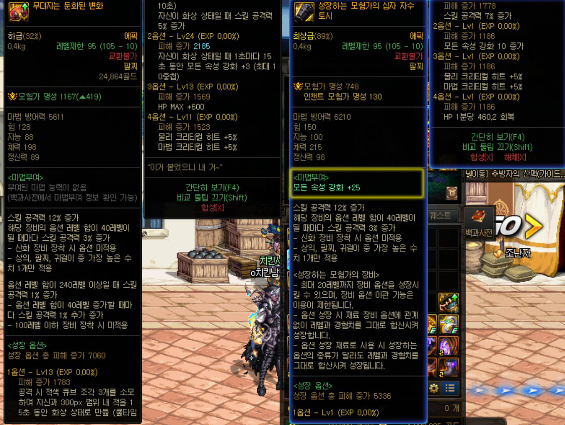 던파 장비 계승 전과 후의 모습입니다. 25000 골드만을 사용하면 마법 부여를 옮길 수 있습니다. 던파 장비 계승 시스템이 얼마나 좋은지 보이시죠? 저는 마법 부여만 옮겼는데, 증폭이나 강화가 된 아이템이라면 더 이득이라고 볼 수 있습니다.