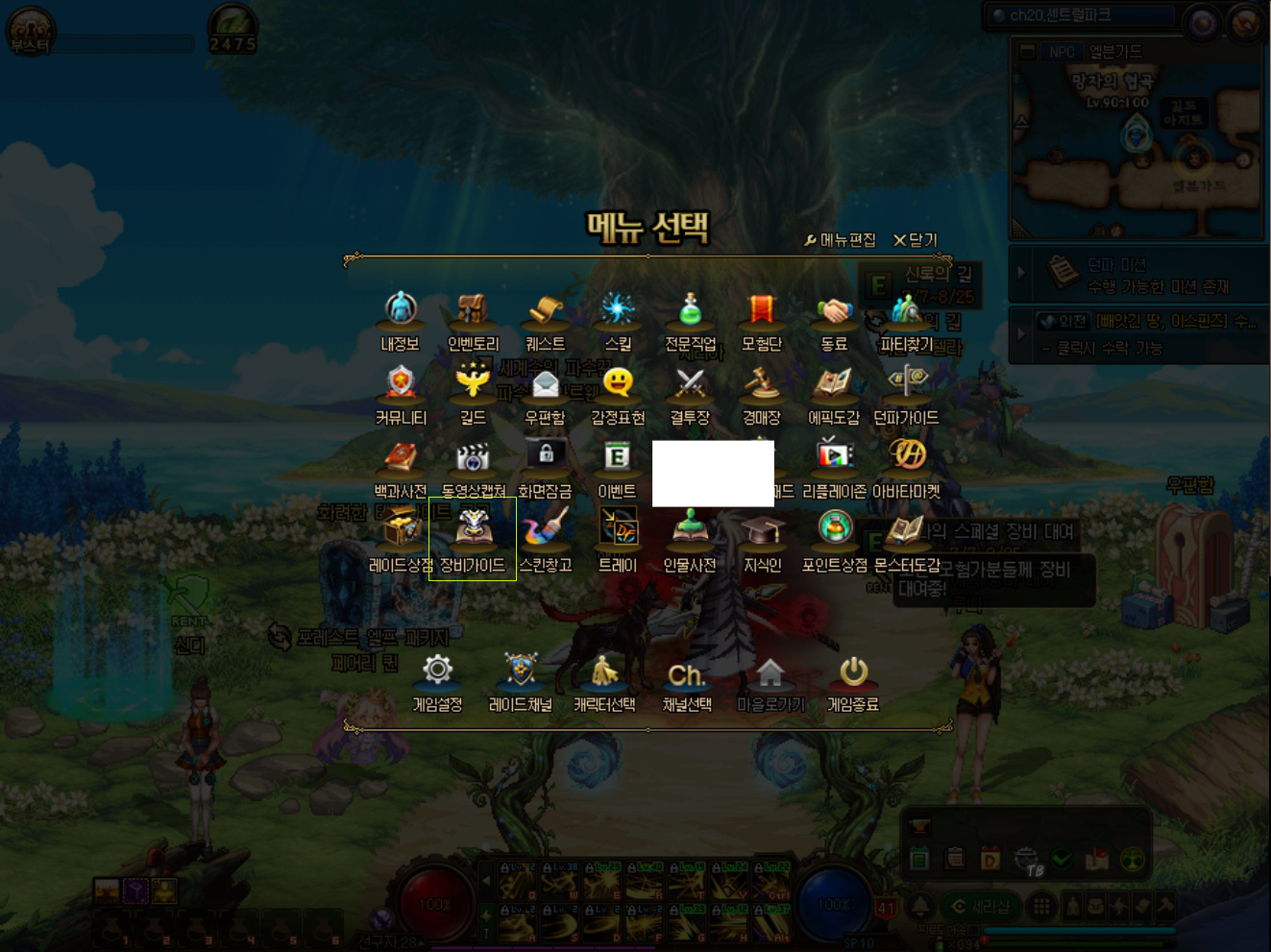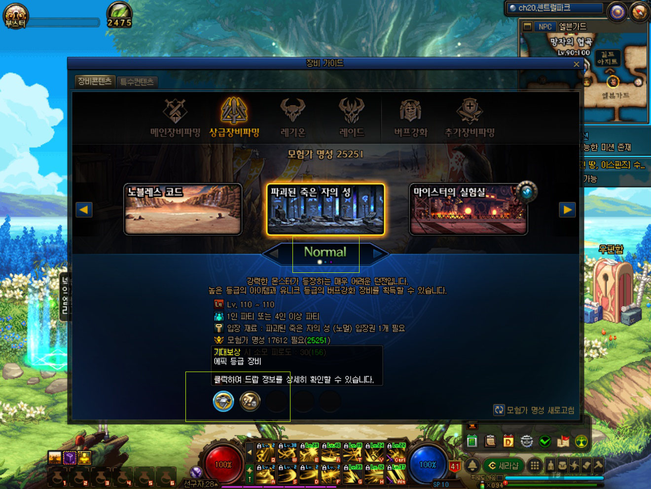 게임상에서 '메뉴 선택(ESC)'창을 열면 '장비 가이드'라고 나와있습니다. 여기를 클릭하시면 위와 같이 모든 던전 별 모험가 명성과 입장 재료, 어떤 장비 아이템이 나오는지 확인할 수 있습니다.