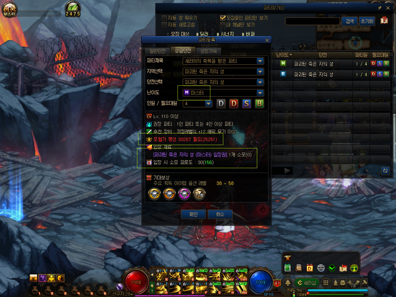 파죽성은 난이도에 따라 모험가 명성 커트라인이 있습니다. 일단 노멀이라도 입장하려면 모험가 명성이 17612 이상이어야 합니다. 그리고 난이도가 높을수록 기대 보상 아이템 성장 레벨이 높아집니다. 따라서 모험가 명성 커트라인을 최대한 난이도별로 맞춘 후에, 더 높은 난이도로 입장하여, 더 높은 성장 옵션 레벨의 아이템을 획득하는 것이 유리합니다. 저도 아직 마스터에 가본 적이 없습니다. 그리고 직접 NPC에게 직접 찾아가 확인하는 방법도 있지만 다른 방법도 있습니다.