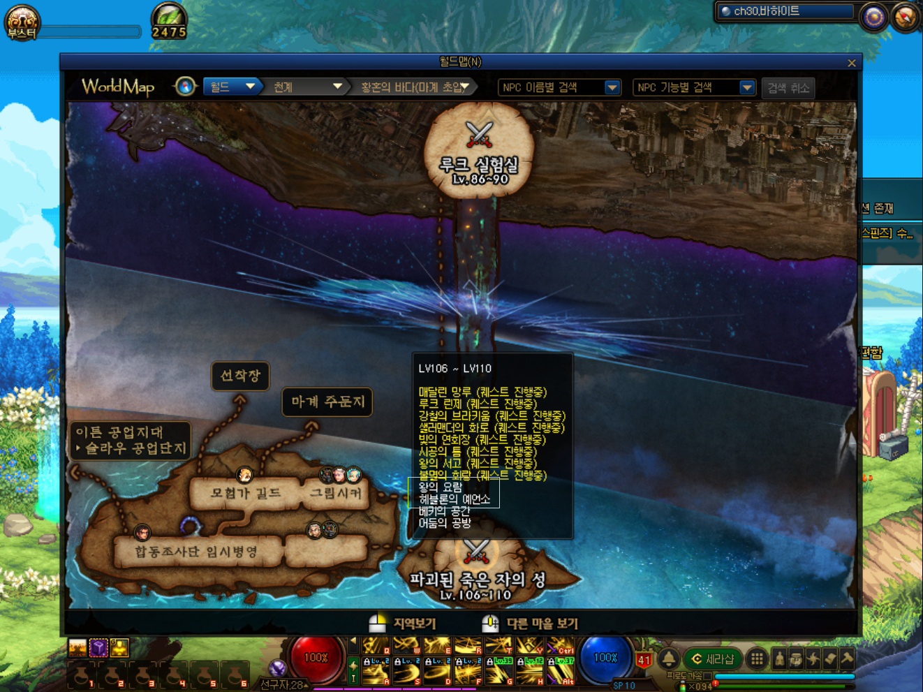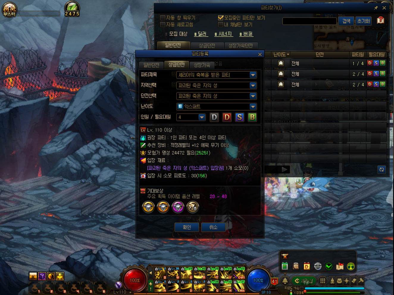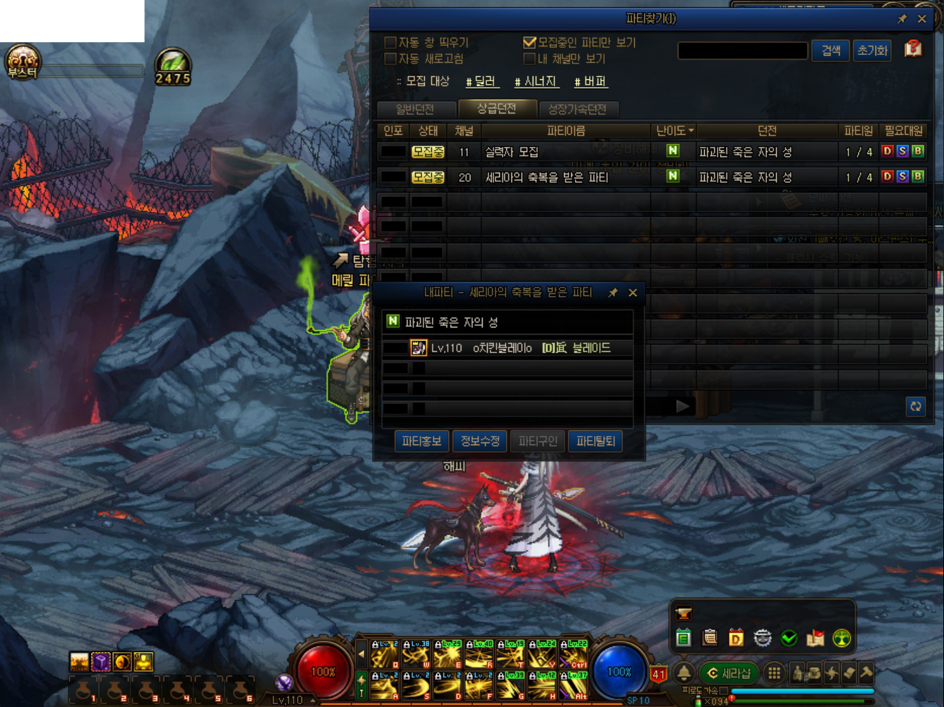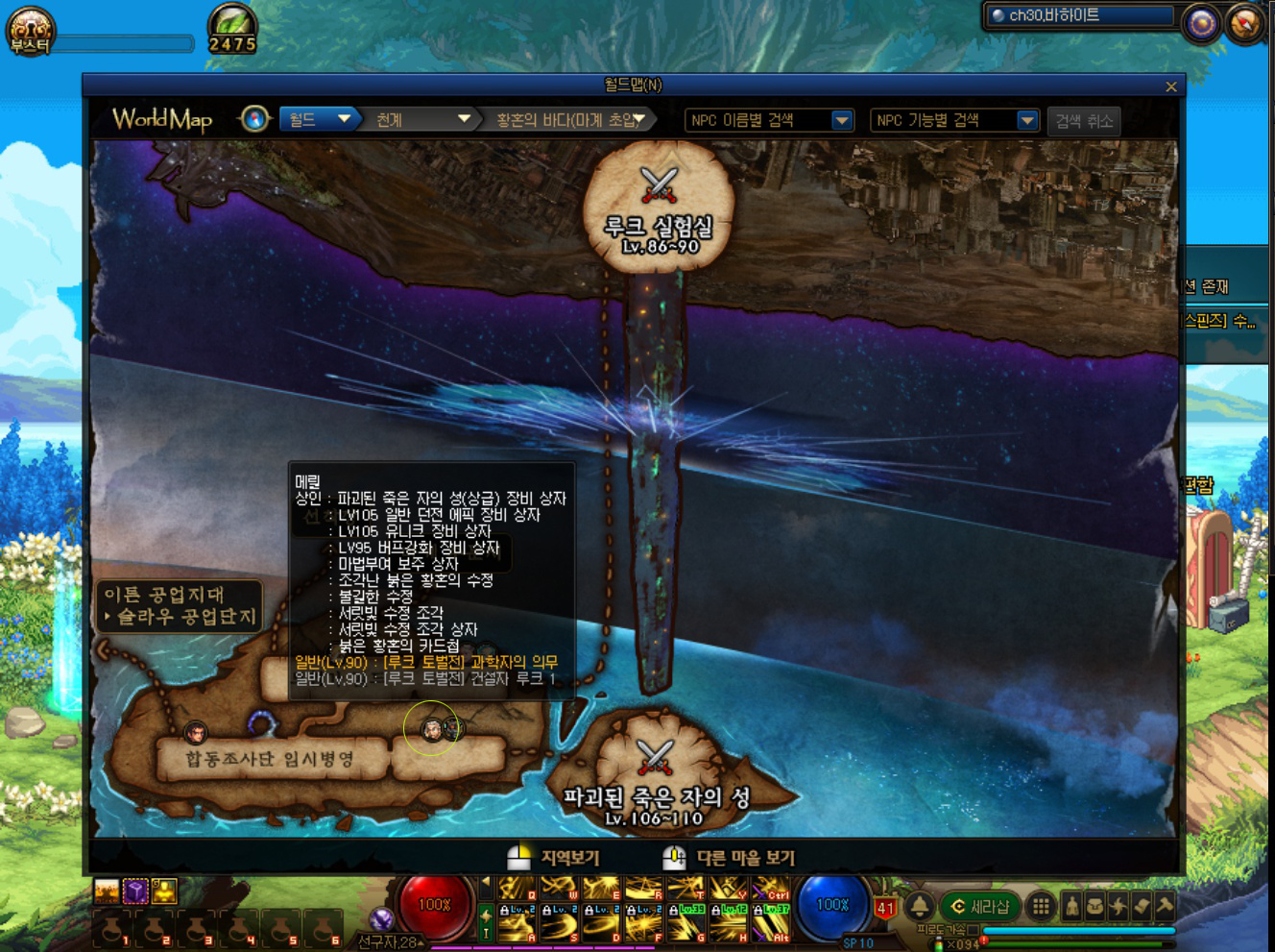 저도 처음에는 파죽성이 어디 있는지도 몰라서, 검색을 했던 기억이 납니다. 위와 같이 '천계-황혼의 바다(마계 초입)'에서 '메릴 파이오니어' 상인을 찾을 수 있습니다. 잘 모르겠다면 일반 던전인 '헤블론의 예언소', '왕의 요람'을 가기 전에 NPC가 있습니다. 저도 파죽성 가는 길을 헤블론의 예언소 가는 길로 기억하고 있습니다. 메릴 파이오니어 NPC를 클릭하면 '파괴된 죽은 자의 성 파티 생성'이 있습니다. 난이도 선택 후, 파티를 생성할 수 있습니다. 그리고 메릴 파이오니어 NPC를 다시 클릭하면 탐험 시작이 있습니다. 던전은 1인 입장이 가능하기 때문에, 혼자서도 할 수 있습니다.