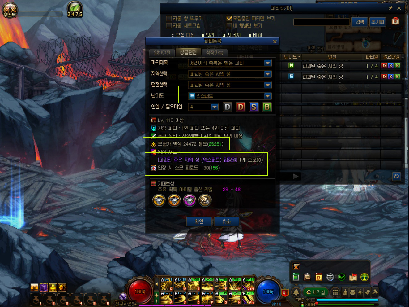 위를 보시면 던파 파죽성의 난이도별로 모험가 명성 커트라인을 확인할 수 있습니다. 또한 입장권도 필요하고 피로도 30이 필요합니다.