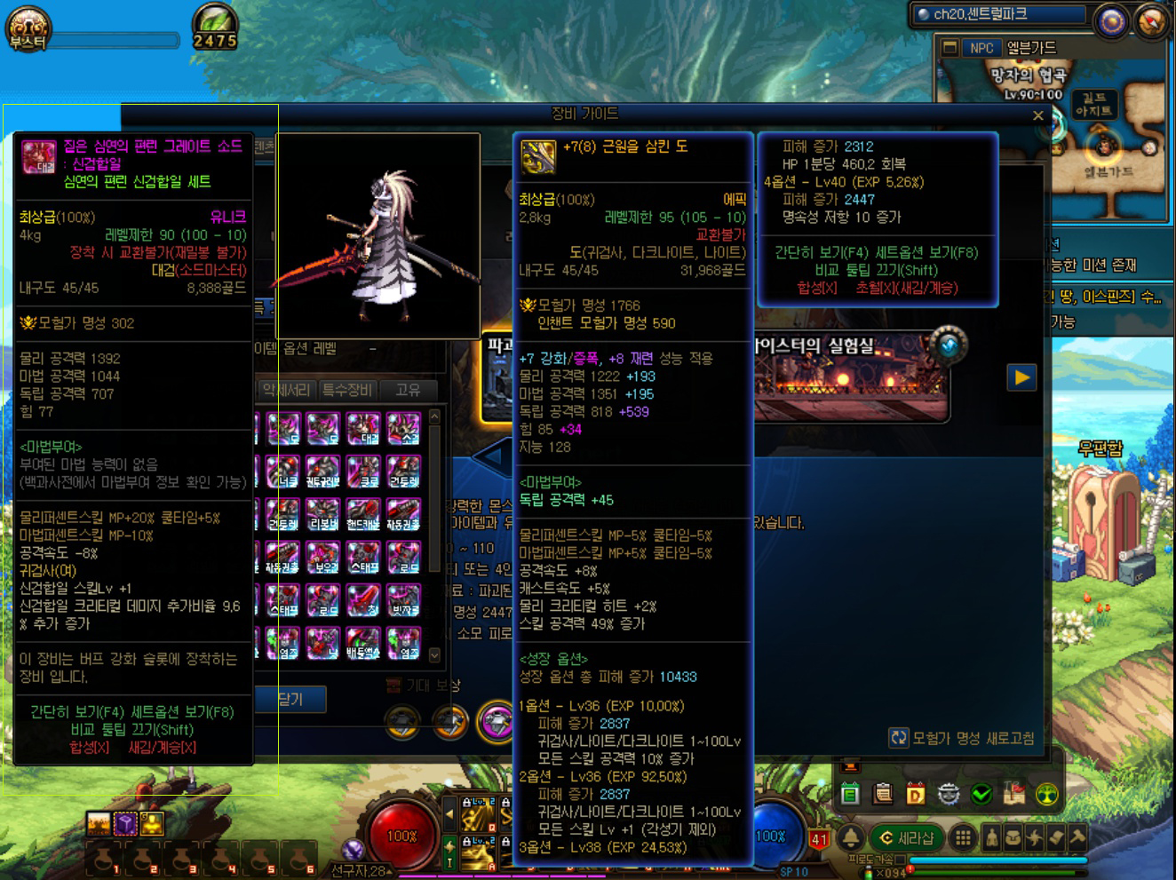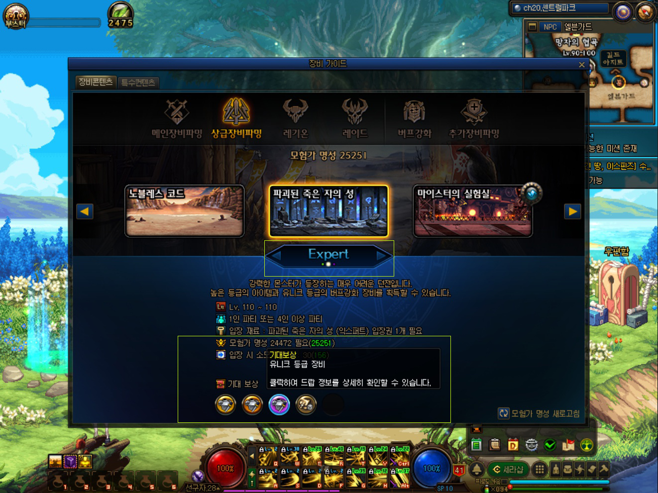 게임상에서 '메뉴 선택(ESC)'창을 열면 '장비 가이드'라고 나와있습니다. 여기를 클릭하시면 위와 같이 모든 던전 별 모험가 명성과 입장 재료, 어떤 장비 아이템이 나오는지 확인할 수 있습니다.