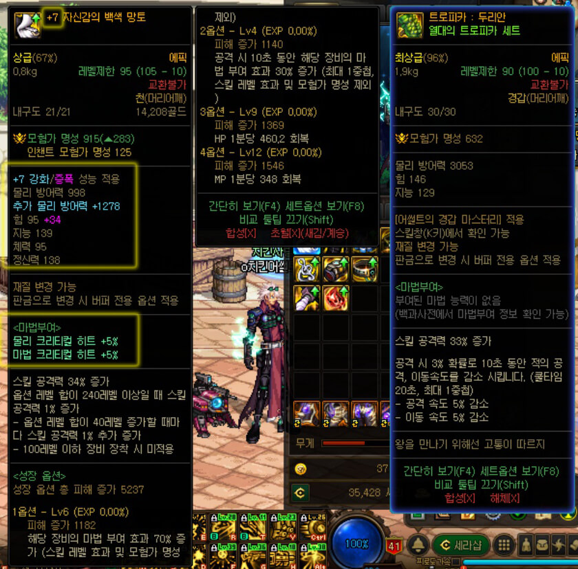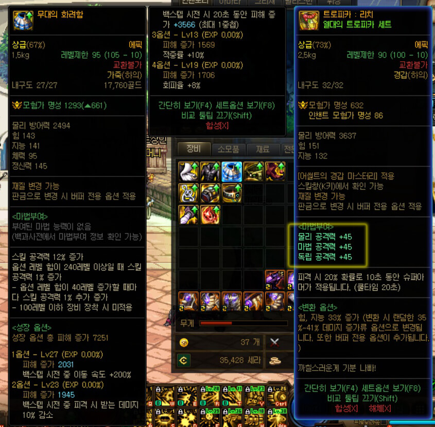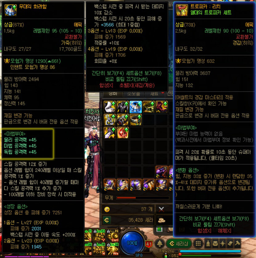 던파 105제 새김 전, 후 모습을 몇 개 더 가져왔습니다. 마찬가지로 100제 아이템 마법부여 부분이 105제 아이템으로 옮겨진 것을 확인할 수 있습니다. 다른 장비들은 증폭이나 강화가 안되어 있어, 마법부여만 옮겼지만 증폭이나 강화된 장비 아이템이라면 새김 시스템이 얼마나 좋은지 알 수 있습니다.