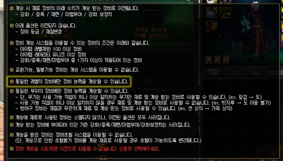 위는 장비 계승 시, 주의사항을 보여줍니다. 던파 105제 새김과의 차이점은 같은 레벨의 장비끼리만 옮길 수 있습니다. 즉, 105제 아이템에서 105제 아이템으로만 '강화, 제련, 증폭, 마법부여'를 이전이 가능합니다. 그리고 던파 새김과 계승의 공통점은 같은 부위끼리만 가능하다는 점입니다. 이 말은 새김과 마찬가지로 신발은 신발끼리, 마법석은 마법석끼리, 팔찌는 팔찌끼리 계승이 가능합니다. 그러나 한 가지 큰 차이점이 있습니다. 바로 무기 부분입니다. 던파 장비 새김은 도는 도끼리, 대검은 대검끼리만 가능하지만 계승은 착용만 가능한 무기이면 소검에서 대검으로 계승 가능하고 대검에서 소검으로 계승이 가능합니다. 따라서 만약에 100제 대검을 사용한 후, 105제 무기는 소검을 사용하고 싶다면 '100제 대검에서 105제 대검으로 새김을 하고 105제 대검에서 105제 소검으로 계승'을 하면 됩니다. 그러면 100제 대검에서 105제 소검으로 변경할 수 있습니다. 던파 장비 계승에 대해, 더 자세히 알아보고 싶다면 아래 사진을 클릭하세요.