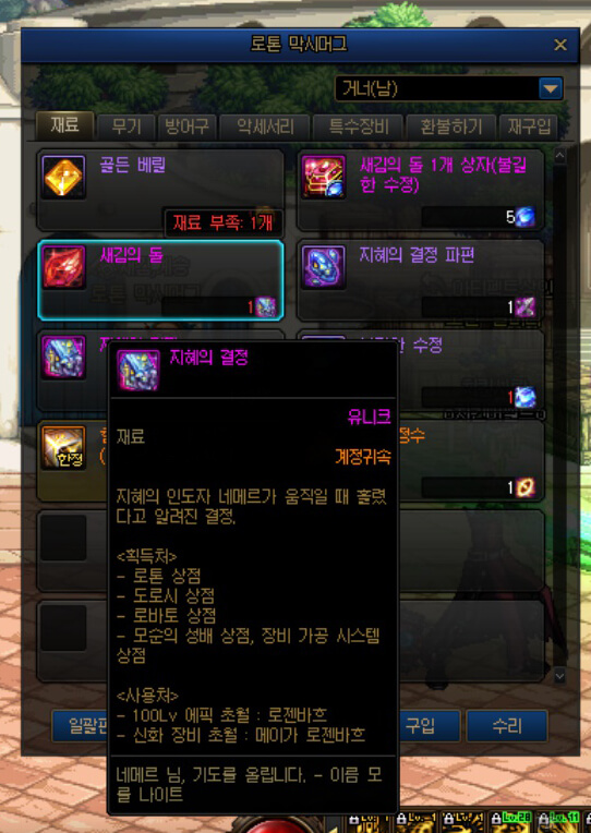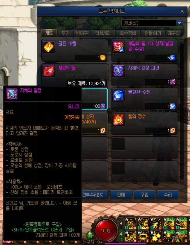 '새김의 돌'은 로톤 막시머그 NPC 상점에서 구매할 수 있습니다. '새김의 돌'은 '지혜의 결정'으로, '지혜의 결정은 '지혜의 결정 파편 100개'로 구매할 수 있습니다. 보통 100제 아이템이 있는 분이라면 '지혜의 결정 파편'이 많을 거라고 생각합니다. 순서대로 '지혜의 결정 파편 100개'로 '지혜의 결정 1개'를 구매하고 '지혜의 결정 1개'로 '새김의 돌 1개'로 변경할 수 있습니다.