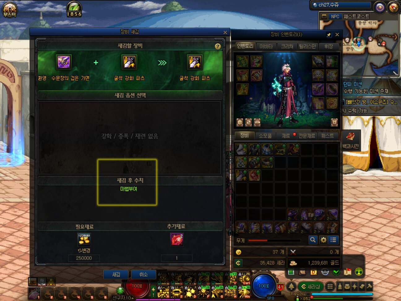 던파 105제 새김 모습입니다. '증폭, 마법부여'가 그대로 옮겨진 것을 확인할 수 있습니다. 위에 수치는 7 증폭이라서, '새김의 돌'이 1개만 필요했습니다. 10 강화, 10 증폭, 5 재련까지는 '새김의 돌'이 1개만 필요하지만 그 이상을 새김 하기 위해서는 '새김의 돌'이 더 필요합니다. 다른 캐릭터로 해보니, '새김의 돌'이 10개 정도 더 필요했던 거 같습니다.