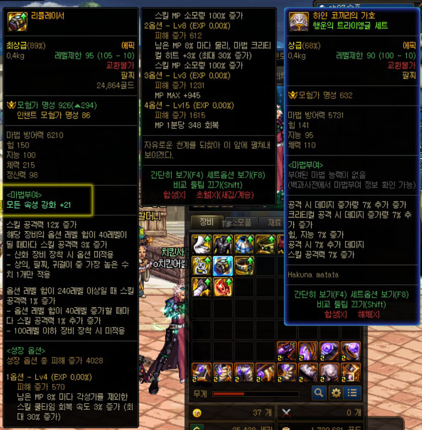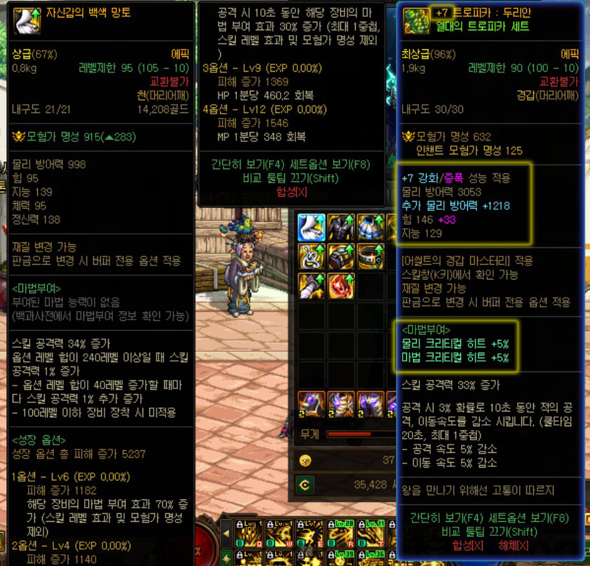 던파 105제 새김 전, 후 모습을 몇 개 더 가져왔습니다. 마찬가지로 100제 아이템 마법부여 부분이 105제 아이템으로 옮겨진 것을 확인할 수 있습니다. 다른 장비들은 증폭이나 강화가 안되어 있어, 마법부여만 옮겼지만 증폭이나 강화된 장비 아이템이라면 새김 시스템이 얼마나 좋은지 알 수 있습니다.