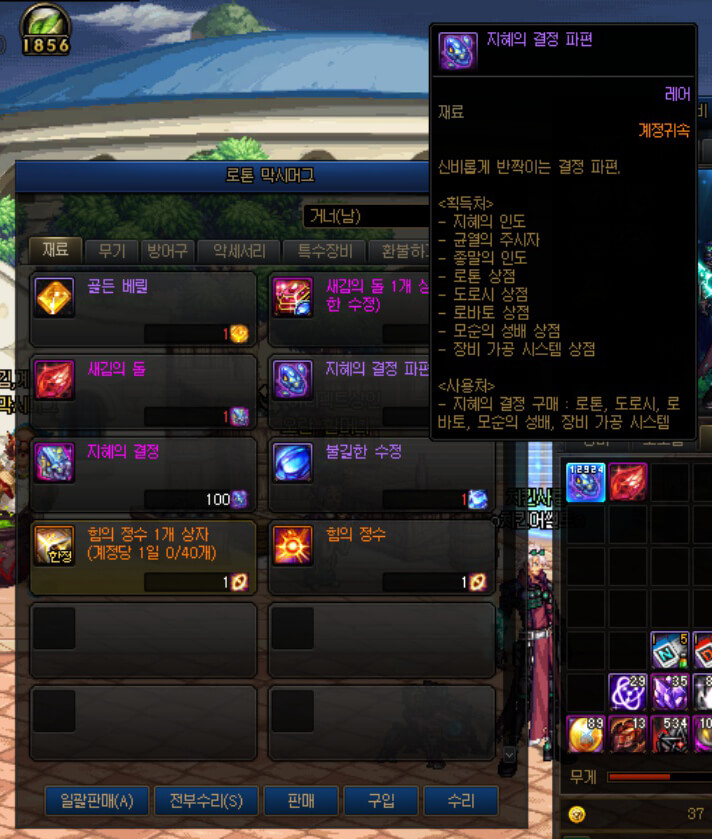 '새김의 돌'은 로톤 막시머그 NPC 상점에서 구매할 수 있습니다. '새김의 돌'은 '지혜의 결정'으로, '지혜의 결정은 '지혜의 결정 파편 100개'로 구매할 수 있습니다. 보통 100제 아이템이 있는 분이라면 '지혜의 결정 파편'이 많을 거라고 생각합니다. 순서대로 '지혜의 결정 파편 100개'로 '지혜의 결정 1개'를 구매하고 '지혜의 결정 1개'로 '새김의 돌 1개'로 변경할 수 있습니다.
