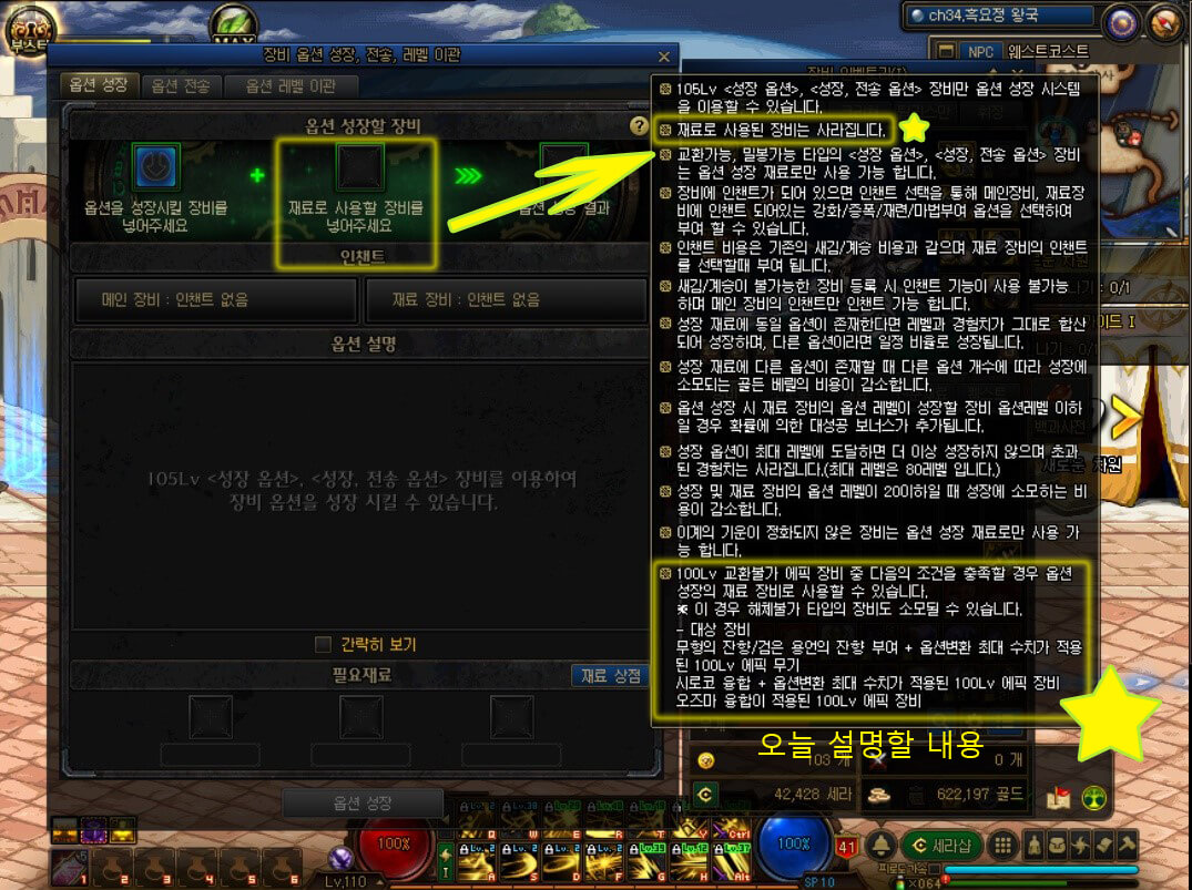 성장 시스템 오른쪽 상단에 있는 물음표 모양을 클릭한 모습입니다. 주의할 점이 있습니다. '재료로 사용한 장비는 사라집니다.'라는 문구가 있습니다. 이 말은 매우 중요합니다. 그 이유는 두 번째 칸에 재료로 사용할 장비가 사라지기 때문에, 마법부여, 증폭, 강화, 재련을 했다면 로톤 막시머그 NPC를 통해, 장비 새김이나 계승을 한 후에, 마법부여, 증폭, 강화, 재련을 옮겨진 후에 재료로 사용해야 됩니다. 꼭 주의하길 바랍니다. 그리고 밑에 큰 별을 보시면 오늘 자세히 설명드릴 내용입니다. 성장 시스템은 동일한 부위만 있으면 105제 아이템의 성장 재료로 사용할 수 있습니다. 하지만 100제 아이템도 성장 재료로 사용할 수 있습니다. 하지만 조건이 있습니다.