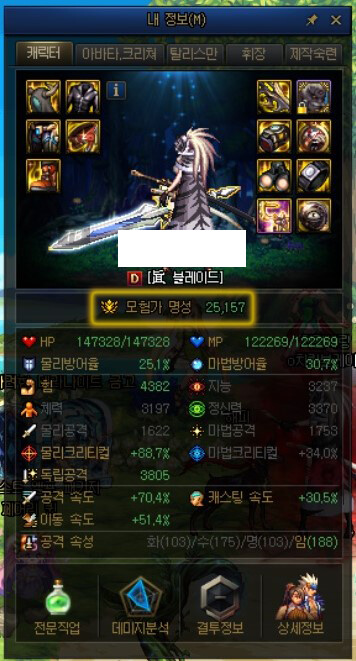 위는 저의 블레이드 내 정보(M) 창입니다. 저도 아직 초반이라 모험가 명성은 그리 높지 않습니다. 이 모험가 명성을 올리면 상위 던전에 입장할 수 있습니다.