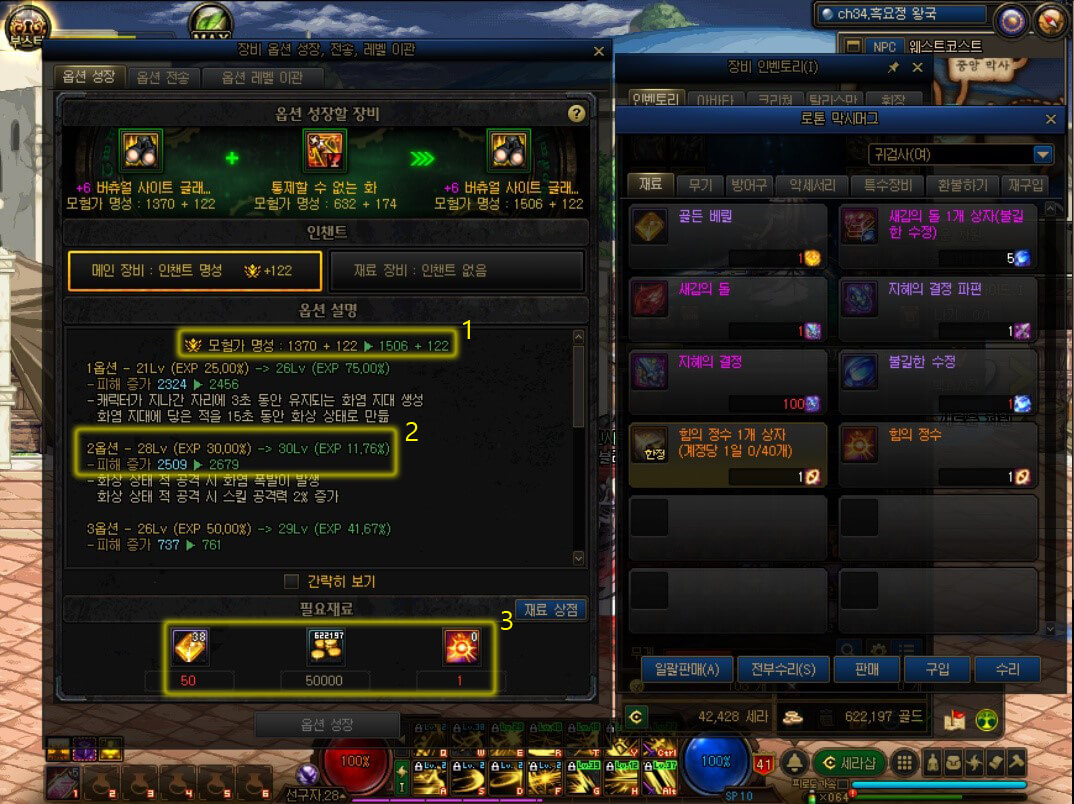 저의 블레이드 아이템 중 하나를 넣어봤습니다. 성장은 꼭 같은 부위끼리 가능합니다. 예를 들면 무기는 무기끼리, 마법석은 마법석끼리 가능합니다. 위 사진의 1번을 보시면 모험가 명성이 올라가는 것을 보실 수 있습니다. 그리고 2번을 보시면 옵션의 레벨 경험치가 증가하고 피해 증가 옵션이 증가하는 것을 알 수 있습니다. 이렇게 성장 시스템을 통해 성장하면 이 두 가지가 상승하는 것을 볼 수 있습니다. 그리고 3번을 보시면 재료가 필요합니다. '골든 베릴 50개, 50000 골드, 힘의 정수 1개'가 필요합니다. 힘의 정수는 오른쪽 재료 상점에서 에픽 소울 1개로 교환할 수 있습니다.
