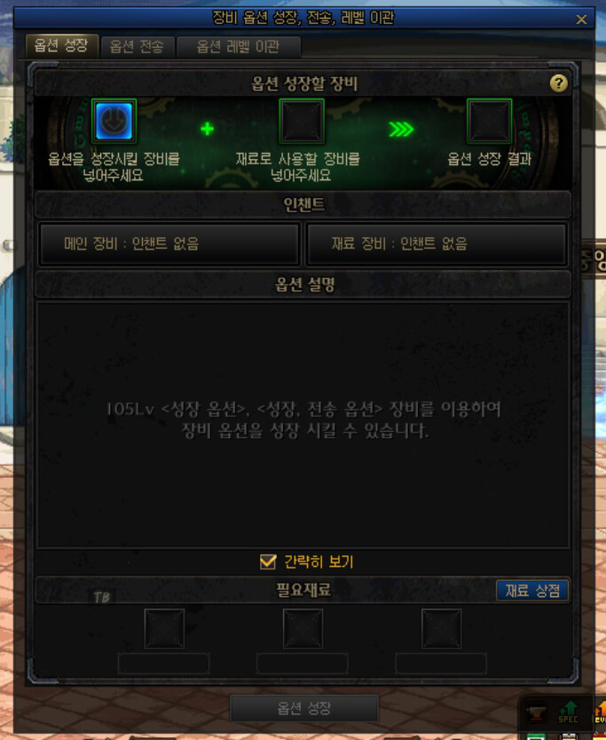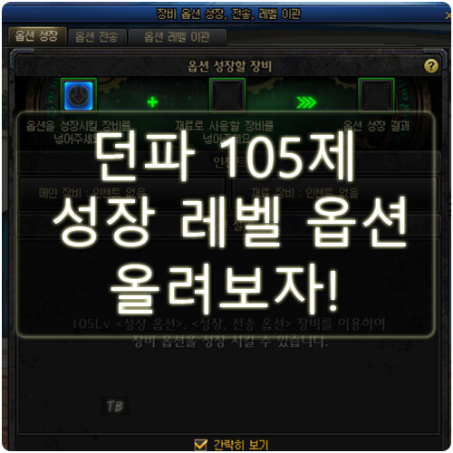위는 던파 105제 성장 시스템 모습입니다. 쉽게 말해 사용하고 싶은 105제 아이템과 필요 없는 아이템을 재료로 사용하여 옵션 레벨을 올린다고 생각하시면 됩니다.