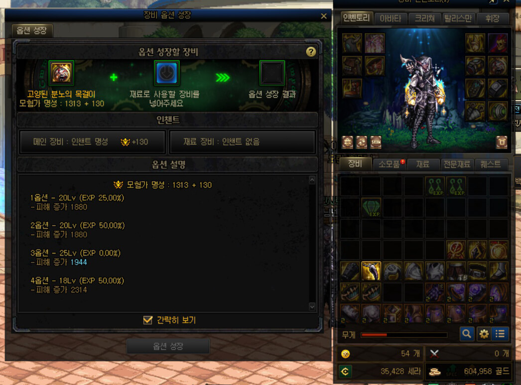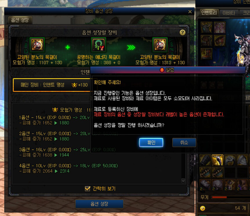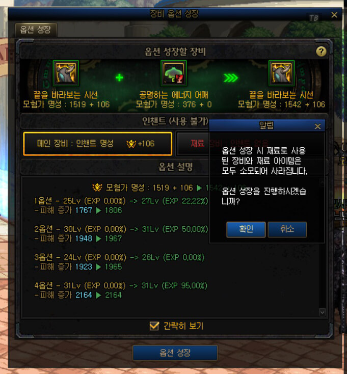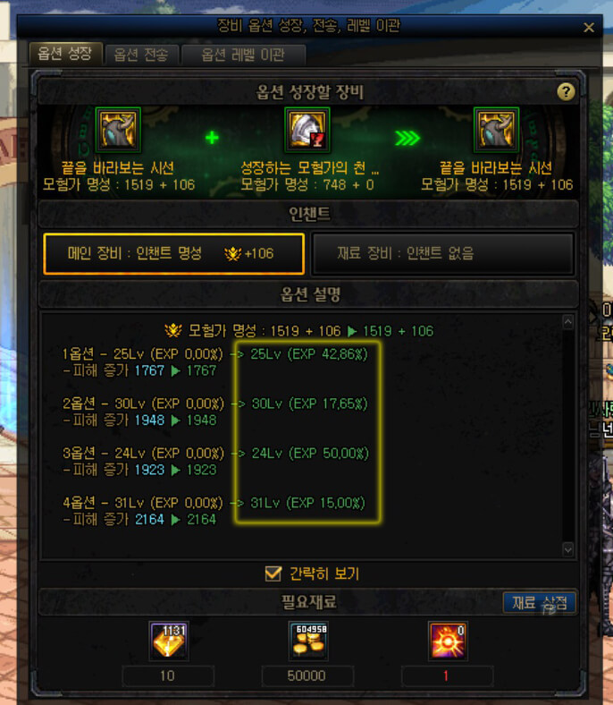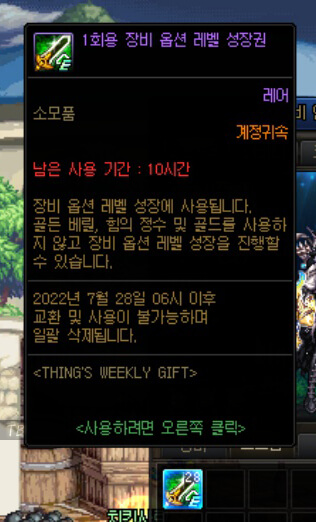 지금 이벤트를 많이 해서, 위와 같이 '1회용 장비 옵션 레벨 성장권'을 많이 주는 편입니다. 이를 이용하면 필요한 재료를 사용하지 않고 옵션 성장을 할 수 있습니다.