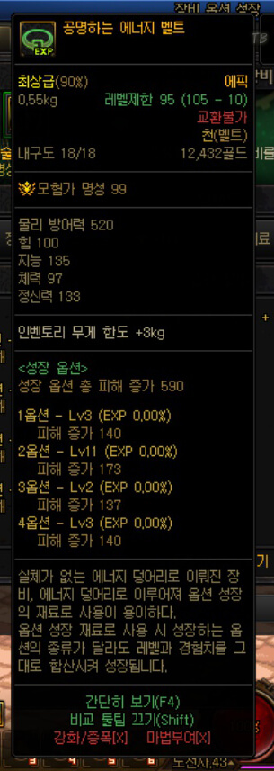 위와 같이 성장 시스템을 통해, 벨트 부위를 성장시켰습니다.
