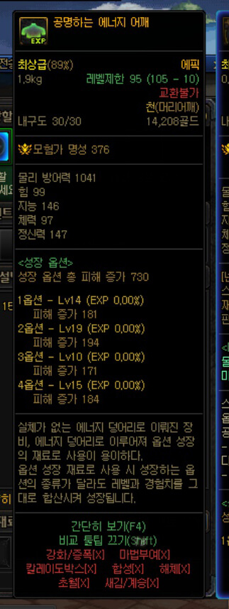 이번에는 일반 105제 에픽 어깨 장비를 재료로 사용했습니다. 이 장비는 이번에 이벤트로 받은 105제 에픽 아이템이라 옵션 레벨이 모두 1입니다. 그래서 오른쪽 사진을 보면 전체적인 옵션 레벨이 거의 오르지 않았음을 알 수 있습니다. 즉, 재료로 사용하는 장비의 옵션 레벨이 높을수록 전체 옵션 레벨이 높아짐을 알 수 있습니다.