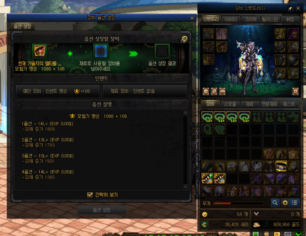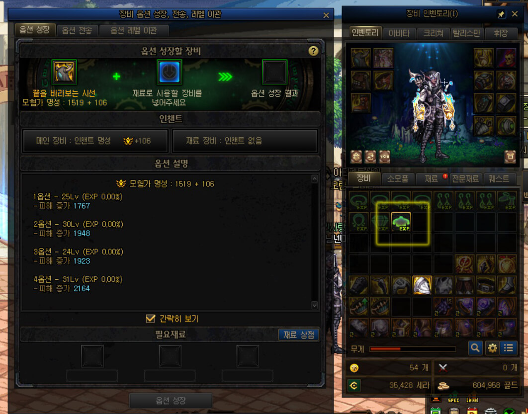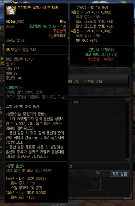 이번에는 일반 105제 에픽 어깨 장비를 재료로 사용했습니다. 이 장비는 이번에 이벤트로 받은 105제 에픽 아이템이라 옵션 레벨이 모두 1입니다. 그래서 오른쪽 사진을 보면 전체적인 옵션 레벨이 거의 오르지 않았음을 알 수 있습니다. 즉, 재료로 사용하는 장비의 옵션 레벨이 높을수록 전체 옵션 레벨이 높아짐을 알 수 있습니다.