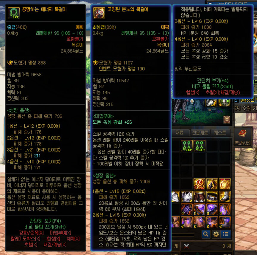 마지막으로 목걸이 부위를 옵션 성장한 모습입니다. 세 번째 모습을 보면 주의점이 한 번 더 나옵니다. 간단히 보면 재료로 사용할 아이템 레벨 옵션이 성장시킬 아이템 레벨 옵션보다 레벨이 높다고 나옵니다. 거듭 말씀드리지만, 재료로 사용할 아이템은 사라지므로 한 번 확인하는 문구입니다. 꼭 넣는 순서를 확인하길 바랍니다. 지금까지 던파 105제 성장에 대해 알아보았습니다. 긴 글 읽어 주셔서, 감사합니다.
