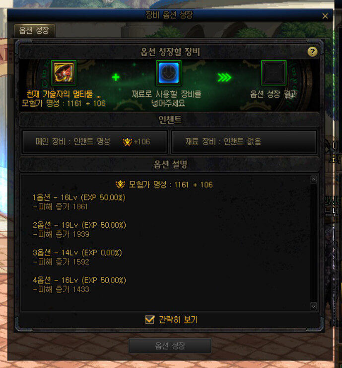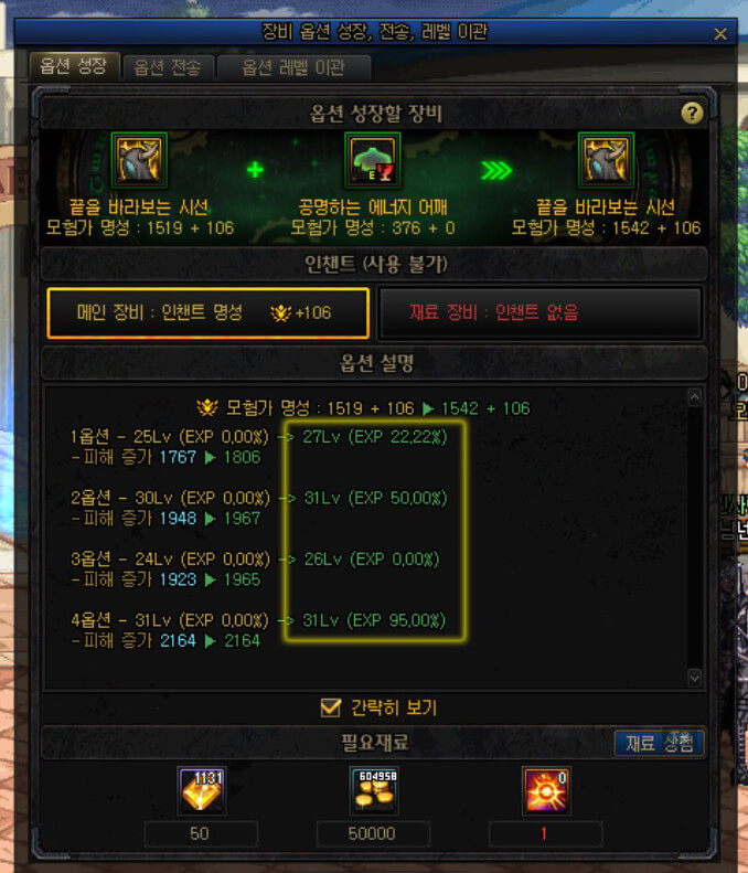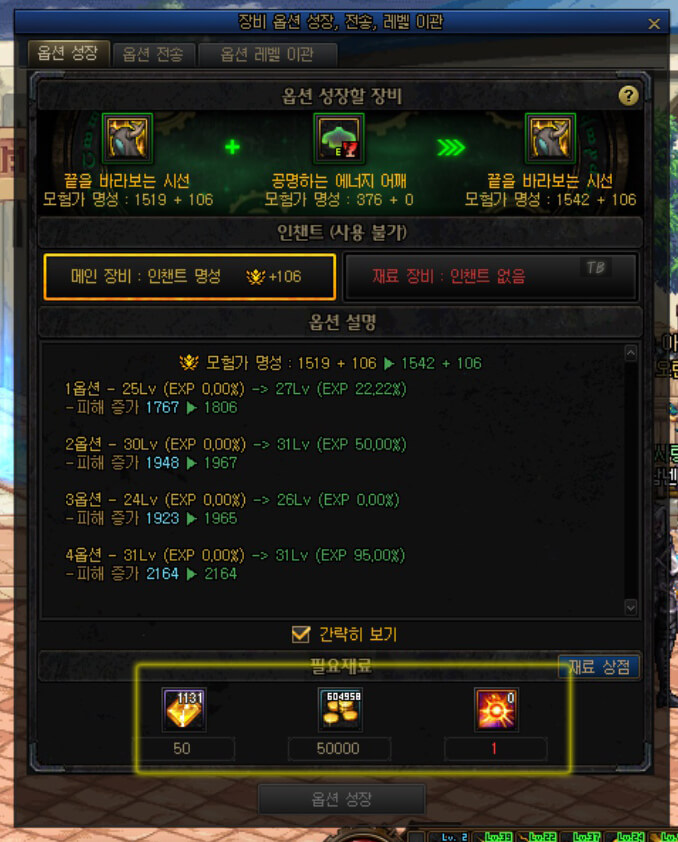 지금 이벤트를 많이 해서, 위와 같이 '1회용 장비 옵션 레벨 성장권'을 많이 주는 편입니다. 이를 이용하면 필요한 재료를 사용하지 않고 옵션 성장을 할 수 있습니다.