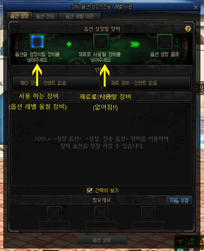 위는 던파 105제 성장 시스템 모습입니다. 쉽게 말해 사용하고 싶은 105제 아이템과 필요 없는 아이템을 재료로 사용하여 옵션 레벨을 올린다고 생각하시면 됩니다.