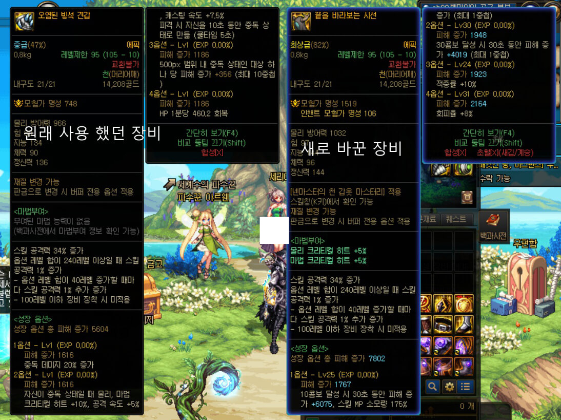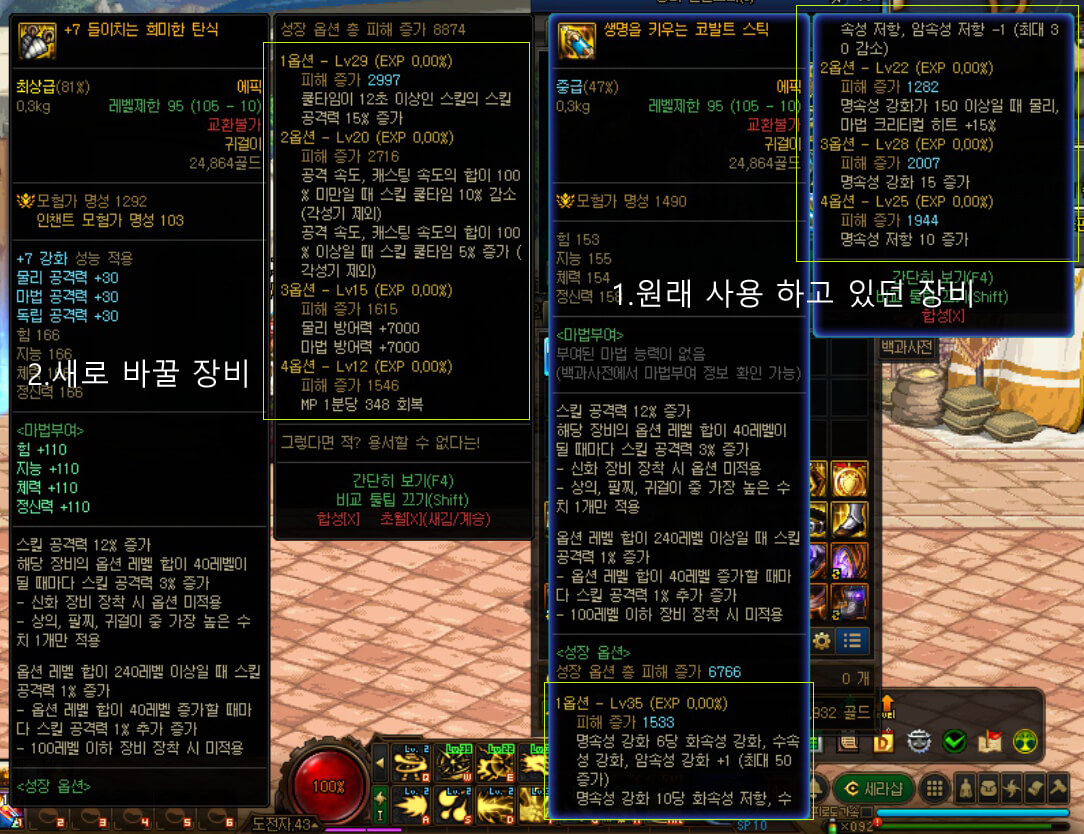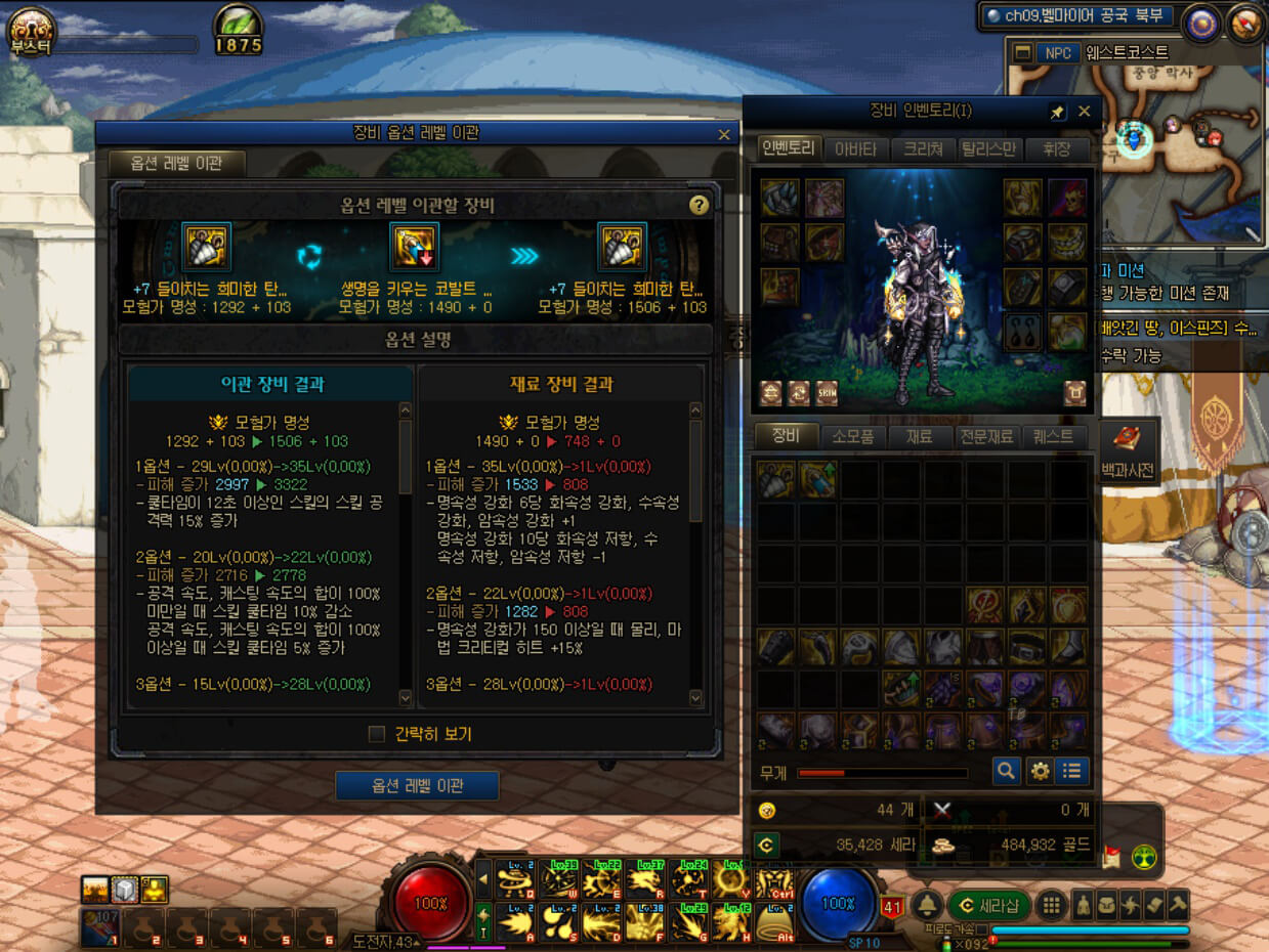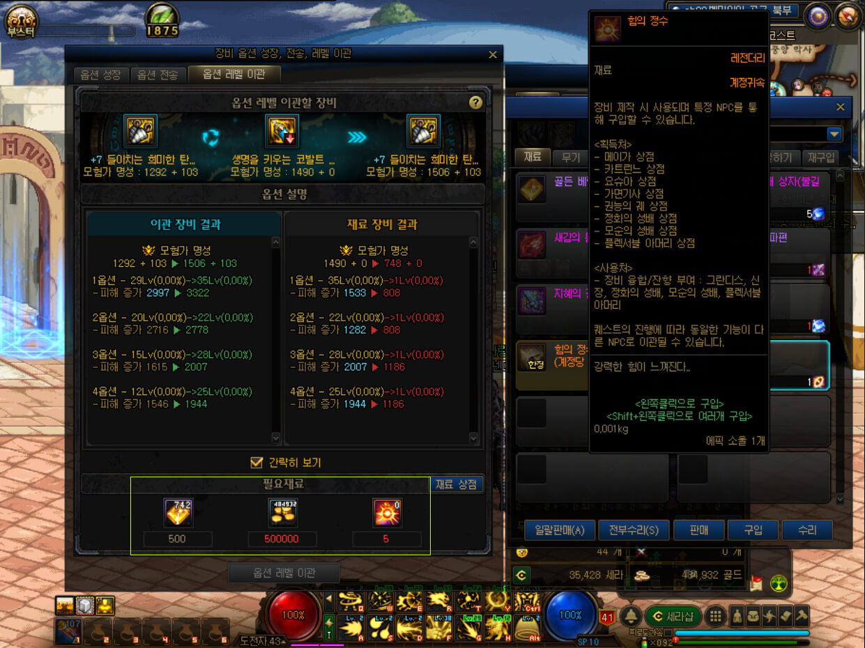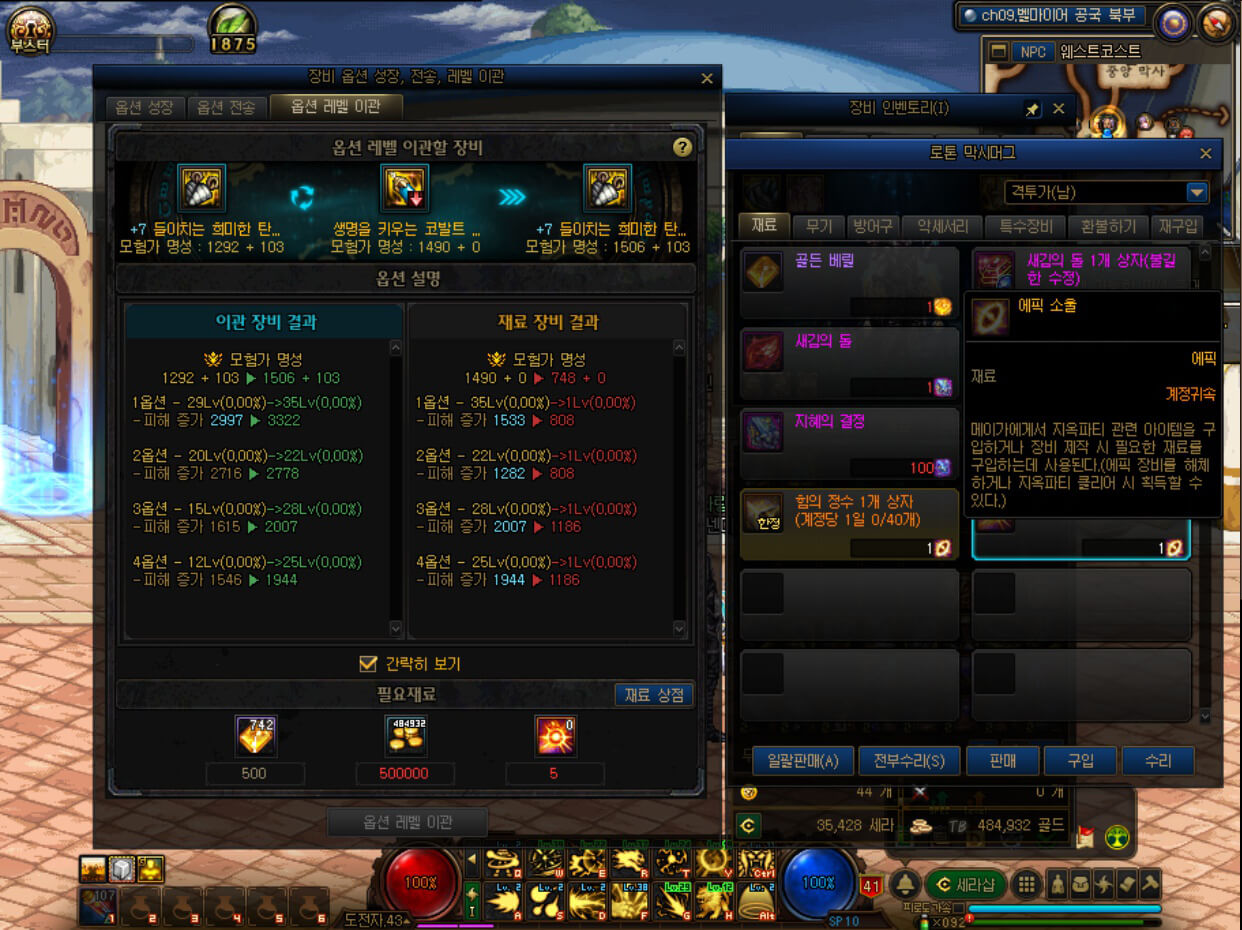 현재는 이벤트로 '1회용 장비 옵션 레벨 이관권'을 많이 주는 편입니다. 그래서 재료 없이도 105제 에픽 옵션 레벨 이관을 할 수 있습니다.
